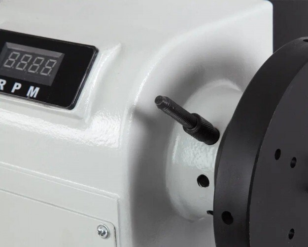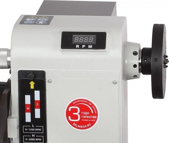 Станок работает в двух диапазонах скоростей:0-1350 и 0-3000 об/мин; Смена диапазонов осуществляется перекидкой ремня между шкивами. Для индикации скорости предусмотрено электронное табло на передней бабке.