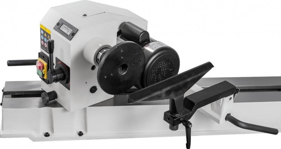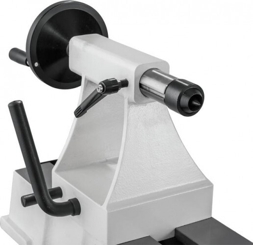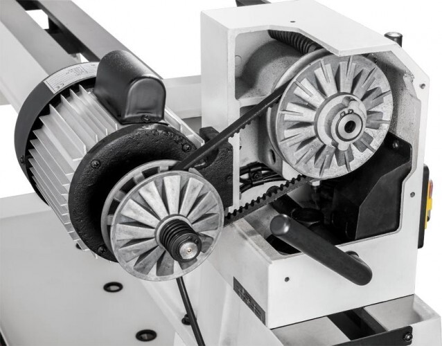 Размеры между центрами и над станиной достаточно велики, чтобы обрабатывать крупные заготовки. Таким задачам соответствует мощный асинхронный 750-ваттный двигатель, имеющий рёбра охлаждения и рассчитанный на продолжительную работу. Для передачи вращения использован клиноременный вариатор, имеющий 10 фиксированных скоростей для удобства переключения. Меняют их, не выключая мотор.