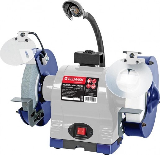 Конструкция: По центру расположен мощный асинхронный двигатель (600 Вт). По обе стороны от двигателя установлены заточные диски диаметром 200 мм и шириной 25 и 40 мм с различной зернистостью. Диски изготовлены из электрокорунда (нормальный 15А и белый 25А). Такой абразив используют для восстановления эксплуатационных свойств ручного инструмента, такого как ножи, топоры, стамески и т. п.; для снятия заусенцев, фасок, обдирки на небольших заготовках. Оба диска оснащены рабочими упорами (подручниками), защитными кожухами (листовая сталь), искрозащитными экранами (один из них с линзой).