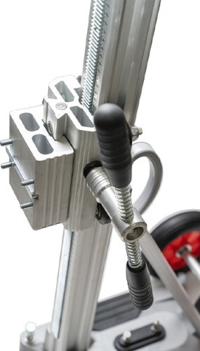 Универсальная и компактная компактная стойка для алмазного бурения с роликовыми направляющими каретки, встроенным вакуумным основанием и быстросъемным креплением электробормотора для сверления отверстий диаметром до 250 мм.