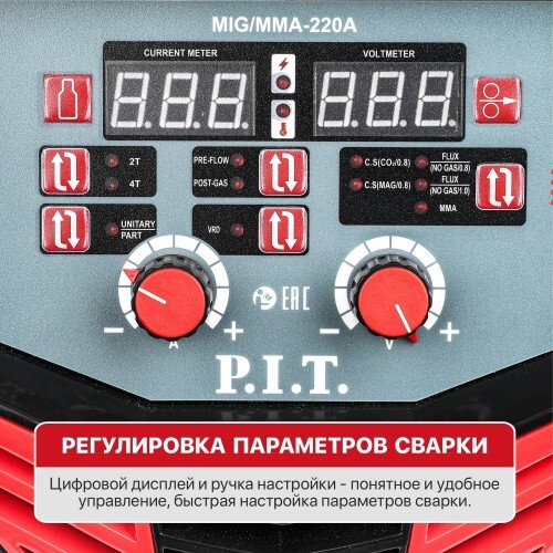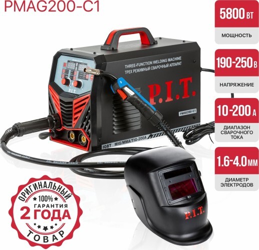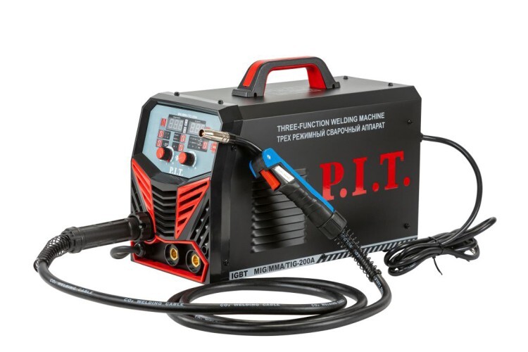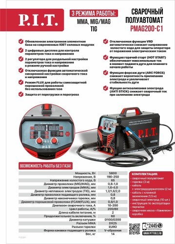 Универсальный инверторный сварочный полуавтомат PMAG200-C1 позволяет осуществлять сразу три типа сварки: MMA – ручная дуговая сварка плавким покрытым электродом, TIG – аргонодуговая сварка неплавящимся электродом в среде инертного газа, MIG/MAG – полуавтоматическая сварка проволокой в среде инертного и активного газов. FLUX (FCAW) – в режиме MIG/MAG предусмотрена возможность смены полярности и сварки самозащитной порошковой сварочной проволокой без использования газов.