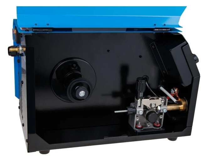 Аппарат оснащен ЕВРО-разъемом, горелкой MIG 3 метра и возможностью смены полярности для сварки проволокой без газа (FLUX).