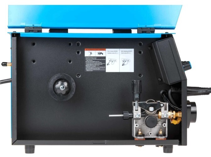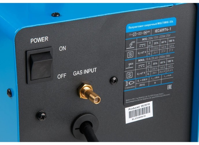 Аппарат оснащен евроразъемом для горелки, возможностью смены полярности для сварки проволокой без газа (FLUX).