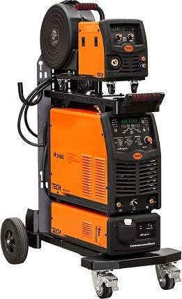 TECH MIG 350 P (N316) состоит из выносного подающего механизма, источника питания и блока жидкостного охлаждения. Все оборудование располагается на удобной тележке с площадкой для крепления баллона. Панель подающего механизма оснащена индикаторами тока и напряжения. На блоке кулера расположен индикатор уровня жидкости, а подключение блока производится без дополнительных проводов.