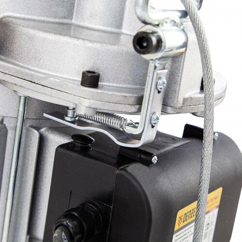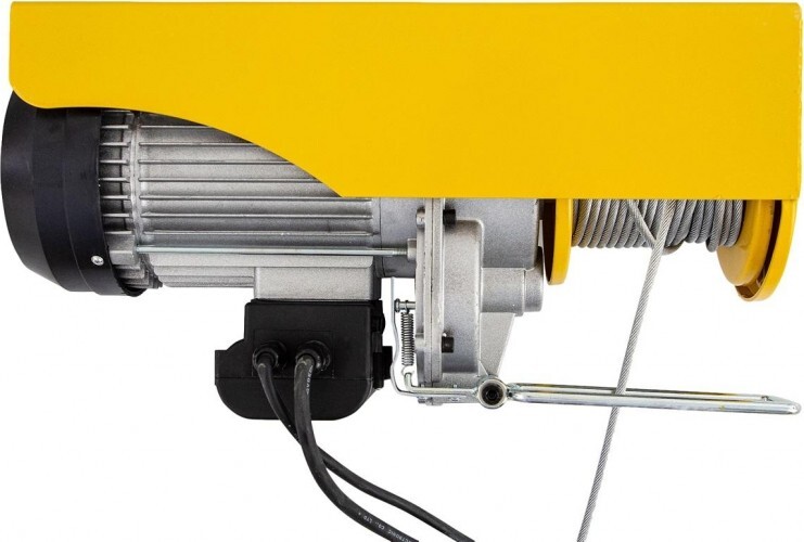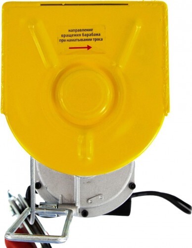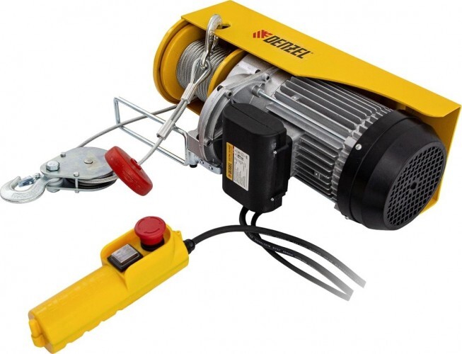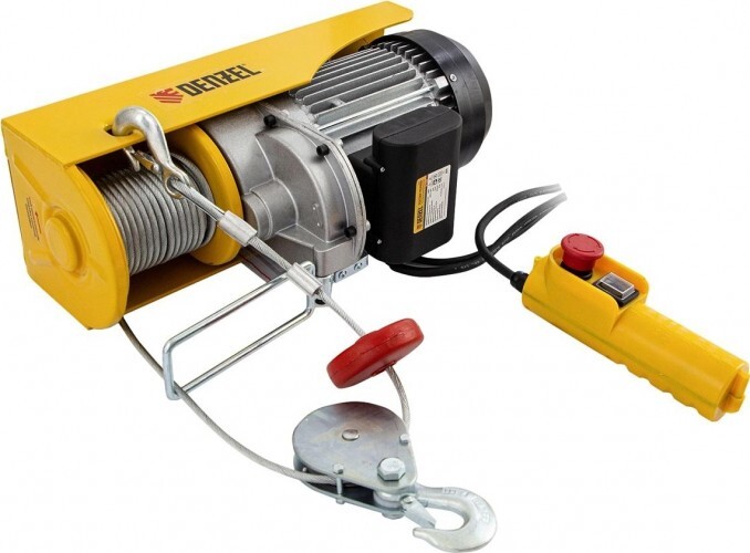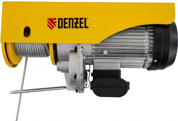 Электрический тельфер Denzel TF-1200. Он способен поднимать грузы весом до 600 кг напрямую и до 1200 кг через блок полиспаста на высоту до 12 м при скорости намотки троса до 8 м/мин. Он применяется на стройках, в автосервисах, в гаражах или на складах.
