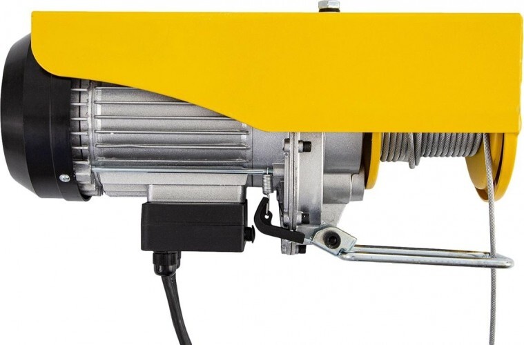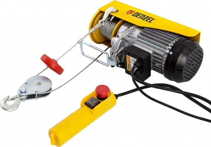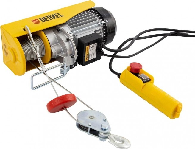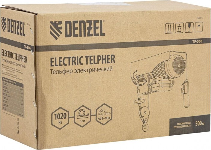 Электрический тельфер Denzel TF-500. Он способен поднимать грузы весом до 250 кг напрямую и до 500 кг через блок полиспаста на высоту до 12 м со скоростью 10 м/мин. Его можно использовать в гараже, в автомастерской, на складе или на строительной площадке.