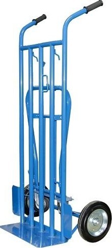 Совмещает в себе преимущества горизонтальной тележки (удобное перемещение мелких грузов), трехколесной наклонной тележки (для крупных предметов) и двухколесной тележки для удобства перемещения.
