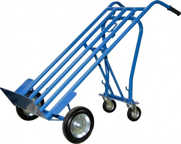 Совмещает в себе преимущества горизонтальной тележки (удобное перемещение мелких грузов), двухколесной наклонной тележки (перемещение крупных предметов) и платформенной горизонтальной тележки.