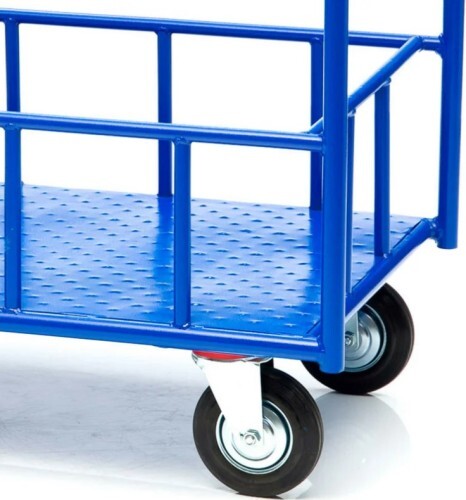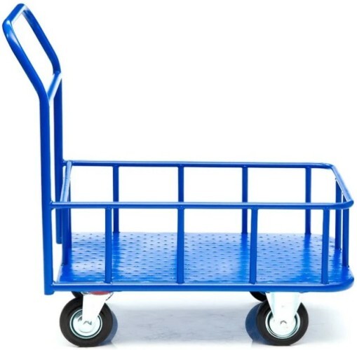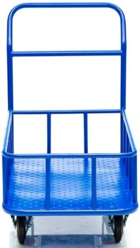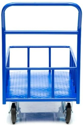 Конструкция тележки цельносварная. Размер платформы 600х900 мм, высота борта 150 мм, высота ручки 750мм. Платформа имеет уникальную рельефную полимерную противоскользящую поверхность. Цвет - синий, шагрень.