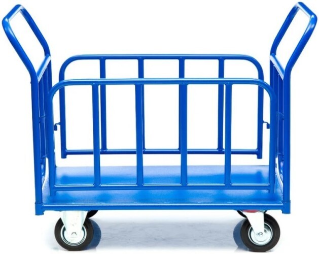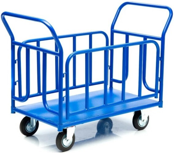 Платформенная 4-х колесная тележка с трубчатыми бортами КПО-500Т-125-И используется для транспортировки различных сборных грузов на оптовых базах и складах. Металлический трубчатый борт защищает груз от падения и ударов, что позволяет перевозить хрупкие предметы и сборные грузы. Ручки и борта тележки снимается для удобства транспортировки и компактного хранения. Высота боковых бортов 400 мм, высота борта от платформы 480 мм, высота ручки 750 мм, каркас платформы труба диаметром 28 мм.