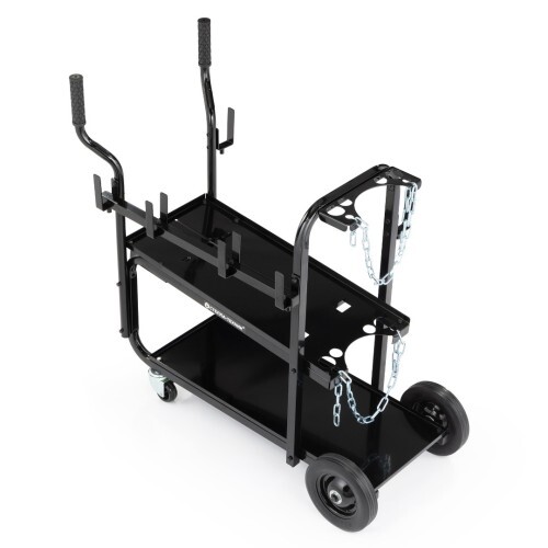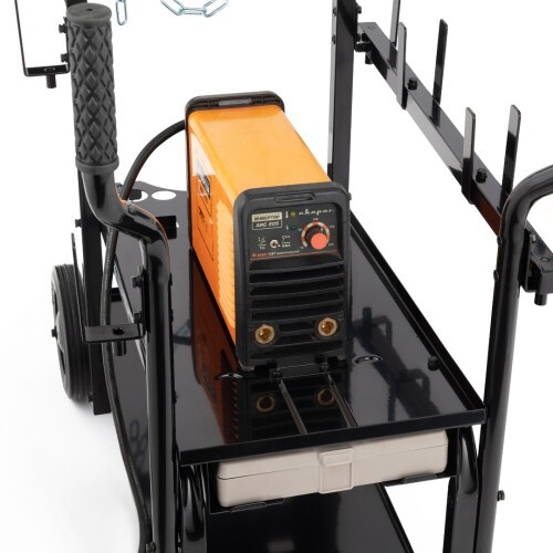 Нижняя платформа 760х305мм с высотой борта 13мм и верхняя 705х310мм с высотой борта 18мм, позволяют разместить и закрепить сварочный аппарат размером до 510х305мм. Платформы обладают большой вместимостью и позволяют разместить на них сварочные принадлежности, такие как: дополнительный сварочный аппарат, плазменный резак, сварочные магниты, плоскогубцы, сварочный шлем, горелка TIG, фартук, перчатки и другие инструменты. Также в комплекте поставляется контейнер для мелкоштучных предметов.