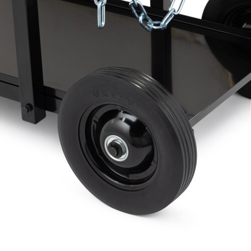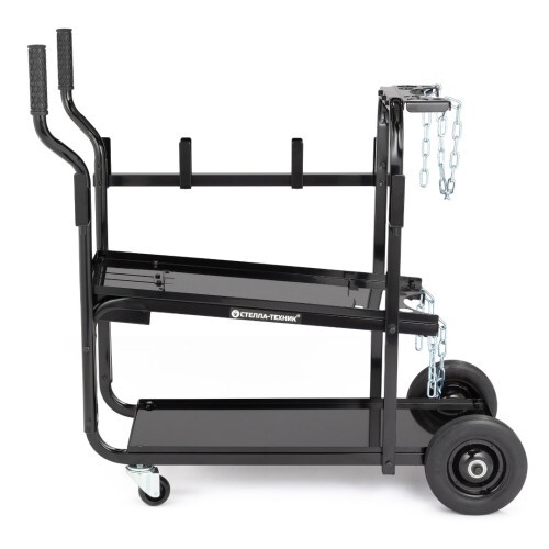 Тележка имеет прочную металлическую конструкцию, которая выдерживает нагрузку до 150 кг. Каркас оборудован площадкой для газового баллона диметром до 20см и цепями для его фиксации, а также кронштейнами для намотки шланга и проводов, благодаря чему они организованы и зафиксированы на тележке, что обеспечивает безопасность и удобство в работе.