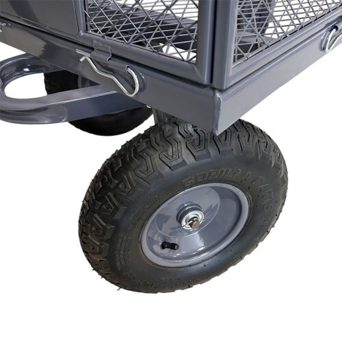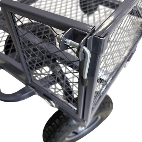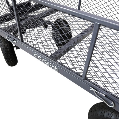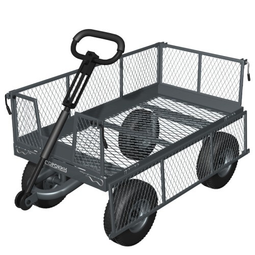 Тележка представляет собой конструкцию с прочным каркасом и поворотной ручкой на пневматических колёсах. Все детали покрыты порошковой краской, что обеспечивает защиту от коррозии и воздействия неблагоприятных погодных условий.