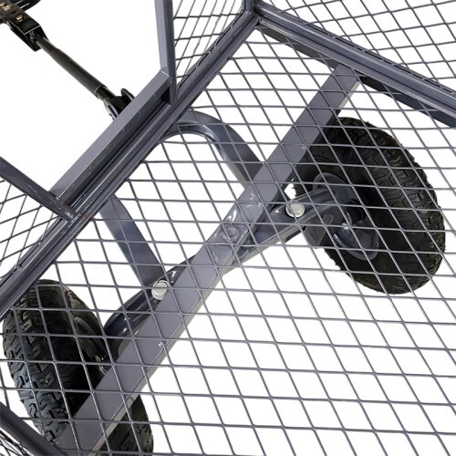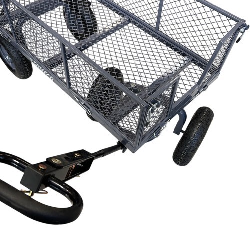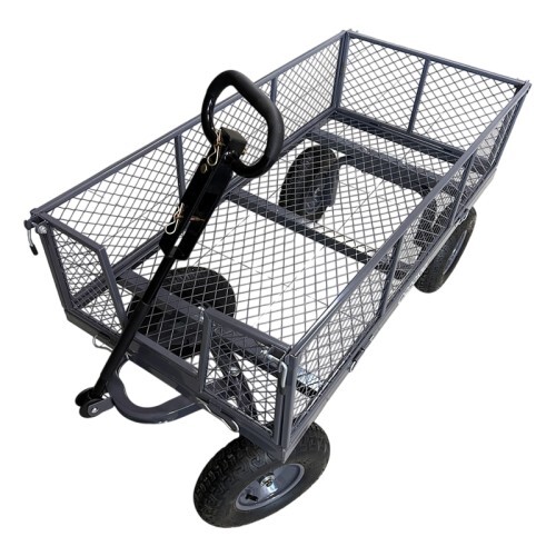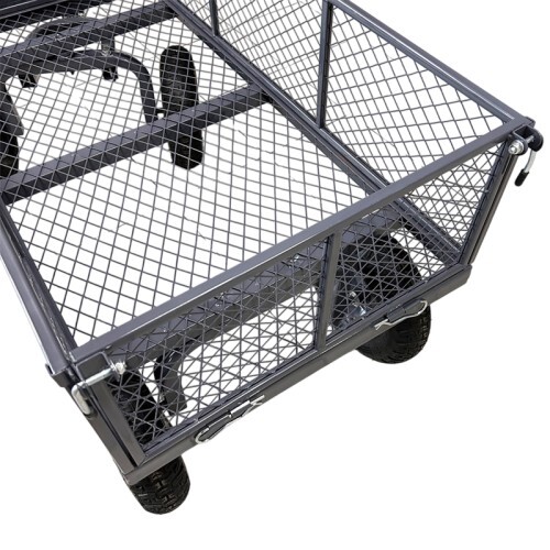 Тележка представляет собой конструкцию с прочным каркасом и поворотной ручкой на пневматических колёсах. Все детали покрыты порошковой краской, что обеспечивает защиту от коррозии и воздействия неблагоприятных погодных условий.