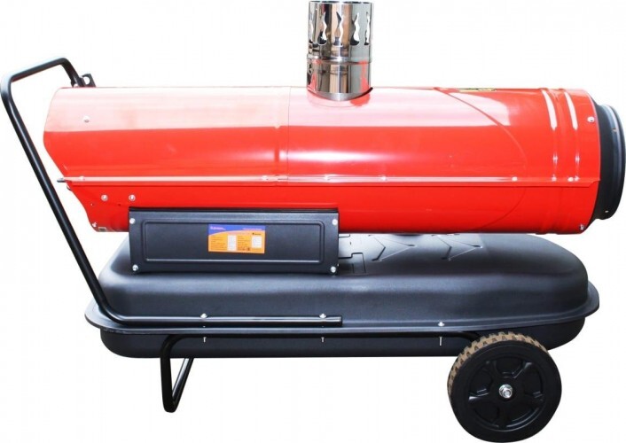 Мобильный нагреватель на дизельном топливе с вентилятором, топливным насосом, форсункой, закрытой камерой сгорания и с отводом отработанных газов.
