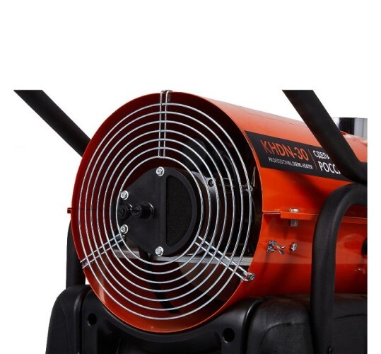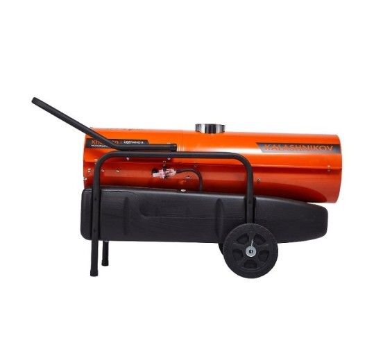 Тепловая дизельная пушка непрямого нагрева KALASHNIKOV KHDN-30 - это мощный теплогенератор, применяемый для обогрева жилых и нежилых помещений, теплиц, складов. Воздух из помещения при помощи вентилятора, расположенного в основании пушки, втягивается внутрь корпуса и, частично попадая в горелку теплообменника, который является камерой сгорания, смешивается с распылённым форсункой дизельным топливом, образуя воздушно-топливную смесь, которая автоматически поджигается посредством электродов. Нагретый воздух вместе с продуктами сгорания, пройдя через теплообменник - выбрасывается наружу из дымохода, расположенного в верхней части корпуса пушки. Весь остальной объём воздуха, обтекая теплообменник нагревается и выбрасывается в обогреваемое помещение, не смешиваясь с продуктами сгорания.