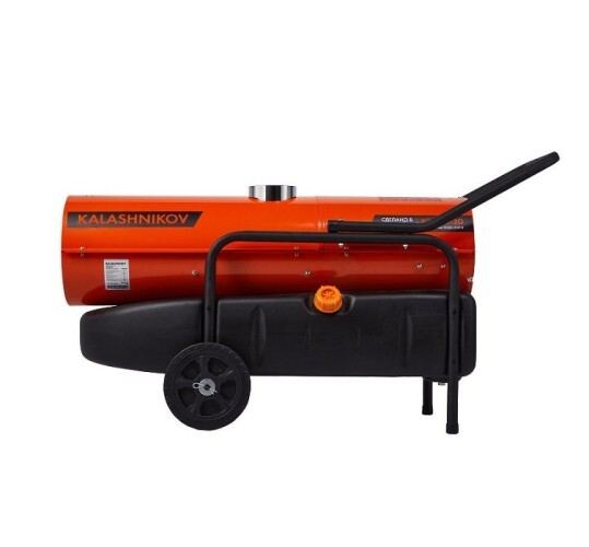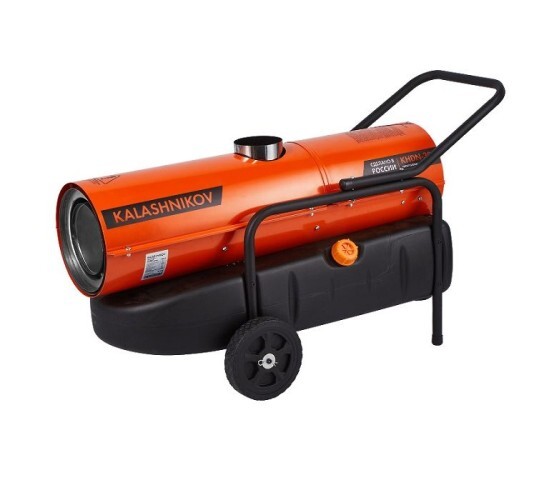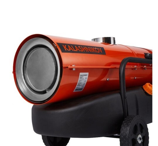 Тепловая дизельная пушка непрямого нагрева KALASHNIKOV KHDN-80 - это мощный теплогенератор, применяемый для обогрева жилых и нежилых помещений, теплиц, складов. Воздух из помещения при помощи вентилятора, расположенного в основании пушки, втягивается внутрь корпуса и, частично попадая в горелку теплообменника, который является камерой сгорания, смешивается с распылённым форсункой дизельным топливом, образуя воздушно-топливную смесь, которая автоматически поджигается посредством электродов. Нагретый воздух вместе с продуктами сгорания, пройдя через теплообменник - выбрасывается наружу из дымохода, расположенного в верхней части корпуса пушки. Весь остальной объём воздуха, обтекая теплообменник нагревается и выбрасывается в обогреваемое помещение, не смешиваясь с продуктами сгорания.