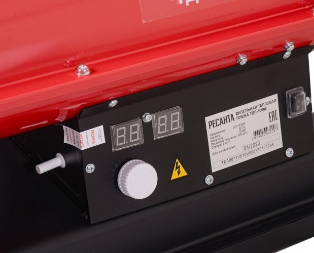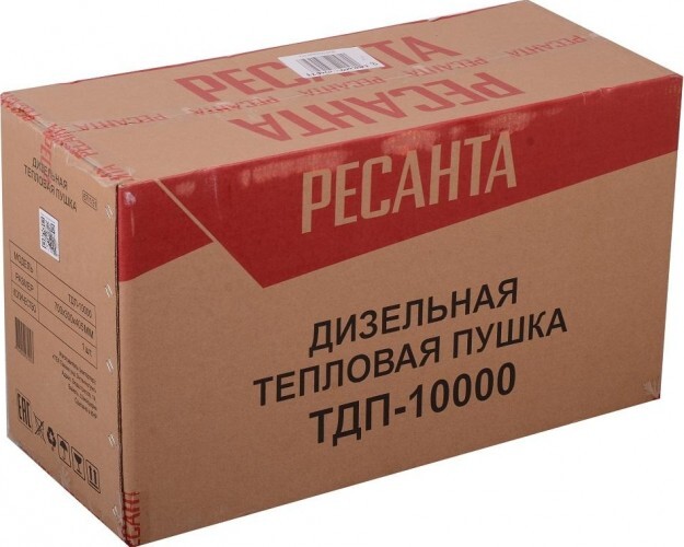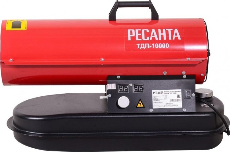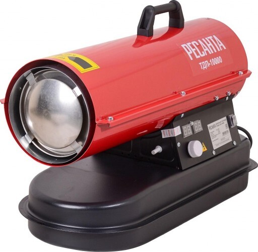 Ресанта ТДП-10000 относится к приборам с прямым типом нагрева. Промышленный вентилятор с производительностью 320 м³/час прогоняет воздух сквозь пламя горелки. Температура выходящего воздуха достигает 800 градусов. Продукты горения отводятся вместе с воздухом. Поэтому дизельные тепловые пушки рекомендовано использовать в нежилых помещениях с качественной вентиляцией. Безопасную эксплуатацию теплопушки обеспечивают три степени защиты. Термодатчик отключает прибор при перегреве. Фотодетектор срабатывает, если пламя горелки погасло. Защита от воспламенения не дает пушке снова включиться после аварийного завершения. Для работы вентилятора и автоматики требуется подключение к электросети 220 В.