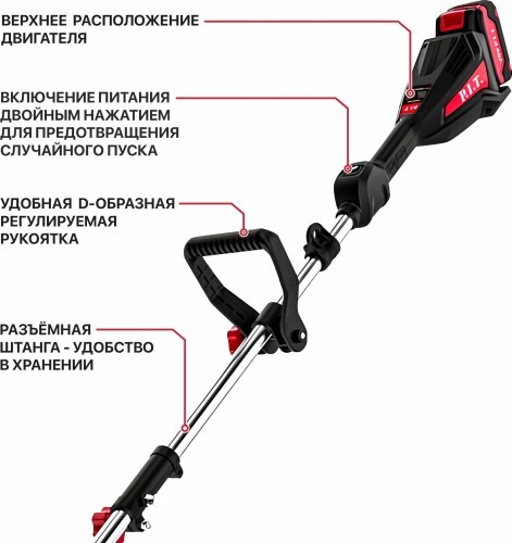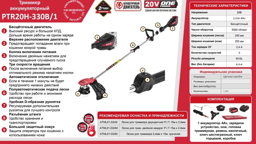 Триммер аккумуляторный P.I.T. PTR20H-330B/1 входит в семейство инструментов единой аккумуляторной системы OnePower20V. Аккумуляторы этой серии имеют защиту от перегрузок, перегрева и глубокого разряда. Благодаря Li-Ion технологии практически отсутствует саморазряд. К инструменту подходят все аккумуляторы серии OnePower20V