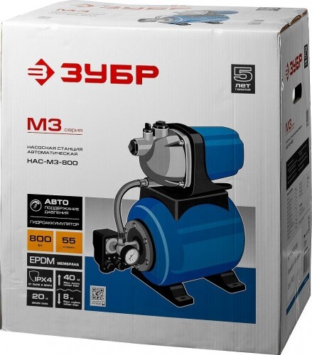 Установка для водоснабжения ЗУБР НАС-М3- 800 предназначена для забора воды с глубины, полива, автоматического поддержания давления при устройстве систем водоснабжения, а термопредохранитель для защиты двигателя и экономичность,благодаря гидроаккумулятору, делают ее незаменимой на дачном участке. Ударопрочный корпус насоса изготовлен из гигиенического армированного стекловолокном пластика. Объем гидроаккумулятора 20 л обеспечивает полноценный водоразбор с более редкими включениями насоса, что продлевает срок его службы и способствует экономии электроэнергии. Соединительный штуцер наиболее распространенного диаметра 1" для легкого подключения. Термопредохранитель для защиты от перегрева предотвращает повреждение двигателя. Автоматическое включение/выключение насоса при изменении давления в магистрали.