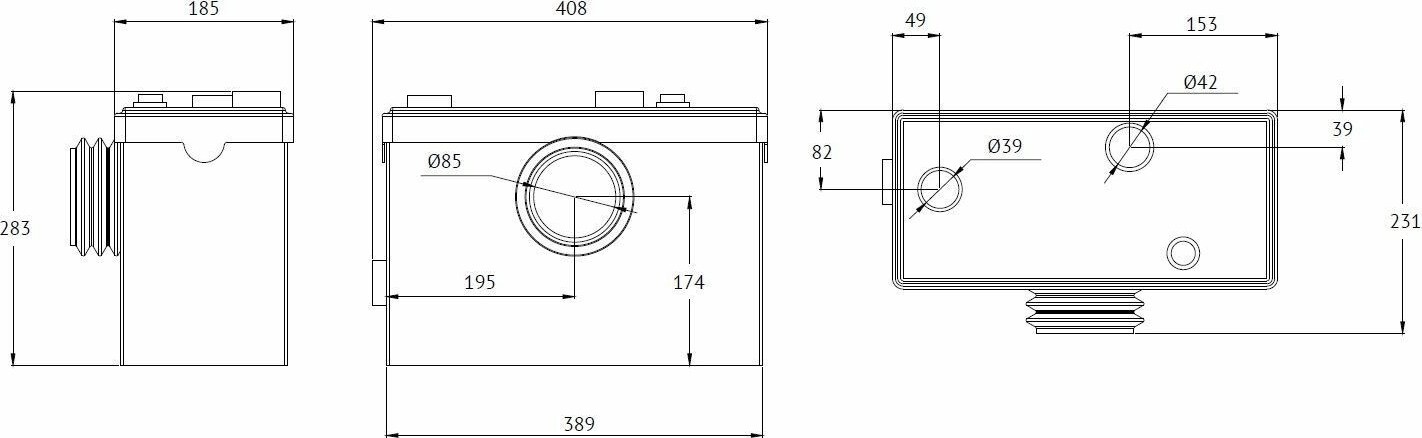 Вход от туалета (DN 100), 2 входа (DN 40) от раковин и т. д., напорный патрубок (DN 40). Макс. температура перекачиваемой жидкости, до +90 °С не более 4 часов).