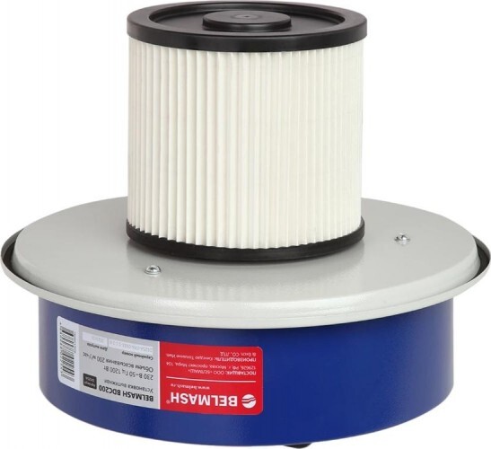 Воздух со стружками всасывается через входной патрубок (диаметром 100 мм) и попадает в цилиндрический корпус установки. Наиболее тяжелые частицы под действием силы тяжести падают вниз. Затем воздух проходит через бумажный фильтр-мешок и попадет в фильтр-картридж (гофрированный полиэстер) и выходит наружу. Степень фильтрации 0,5 мкм - самая большая в линейке вытяжных установок BELMASH.
