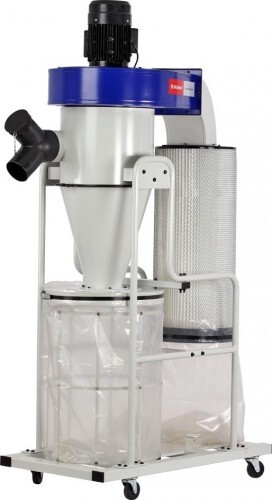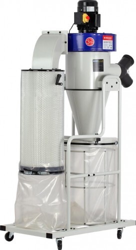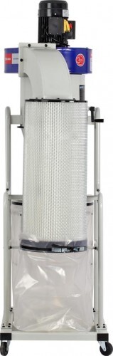 Сначала воздух с большой скоростью тангенциально подается внутрь цилиндрической части корпуса циклона. Под воздействием центробежной силы крупные частицы отбрасываются к стенкам, а затем вниз – в коническую часть аппарата. Оттуда отходы попадают в большой стружкосборник (470 × 920 мм). Это первая ступень очистки. Затем воздух поступает в фильтр-картридж, где за счет прохождения потока через фильтрующий элемент с большой площадью поверхности (3,5 кв. м) происходит окончательная очистка. Мелкие частицы собираются в малом мешке, который крепиться под фильтром. Это вторая ступень очистки.