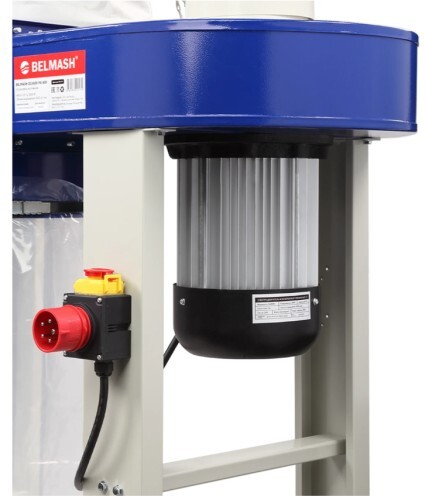 BELMASH DC4500-F3/400 состоит из трех одинаковых секций. К разделительным корпусам зажимами крепятся фильтр-мешки сверху и стружкосборники – снизу. Все корпуса последовательно соединены между собой и с улиткой. Они установлены на общем основании с помощью кронштейнов и стоек. Для поддержания высокой производительности установка оснащена асинхронным двигателем мощностью 3800 Вт (режим работы S1). Рассчитана на подключение к трехфазной сети 400В.