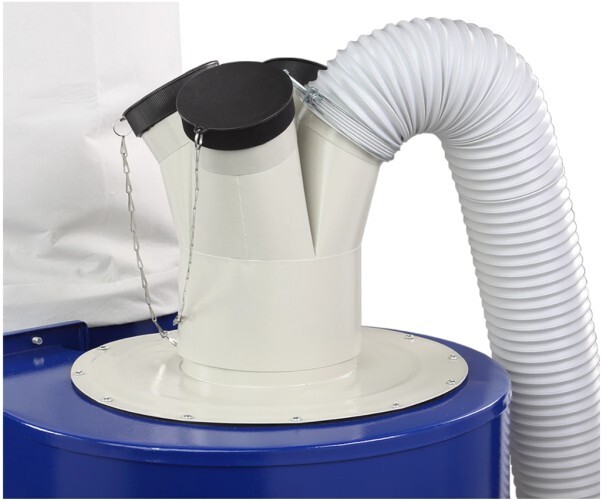 Крыльчатка, детали корпуса и адаптер выполнены из стали, что дает устойчивость к ударным нагрузкам. На входной патрубок вытяжки (Ø180 мм) устанавливается адаптер с четырьмя входами (Ø100 мм). Одновременно можно подключить четыре точки удаления отходов резания. Не задействованные патрубки закрываются крышками.
