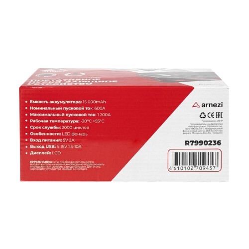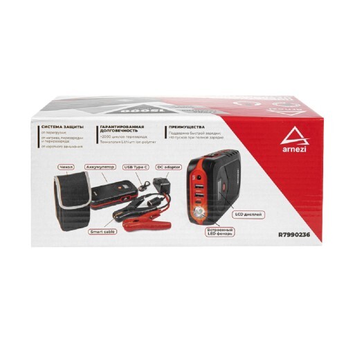 ARNEZI R7990236 портативное PRO-15 предназначено для запуска легковых автомобилей, мотоциклов и других приборов, которые используют 12В аккумуляторы. Устройство можно использовать для зарядки или питания различных мобильных гаджетов и портативных устройств: телефонов, ноутбуков, планшетов.