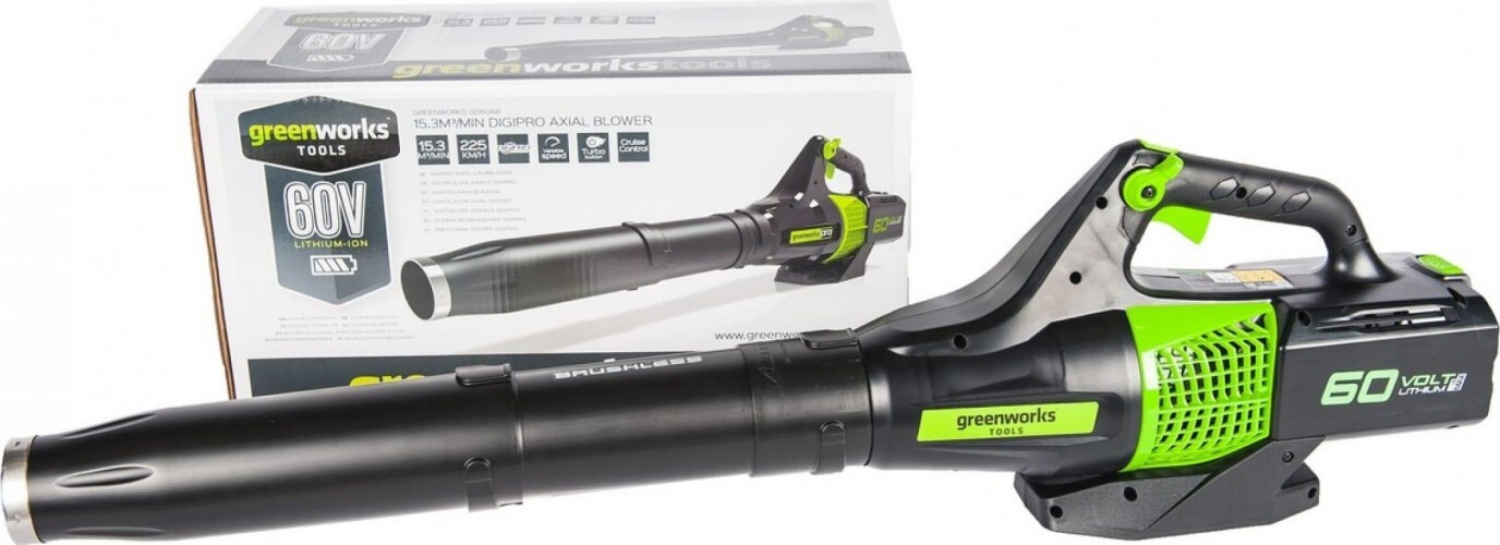В комплект GD60ABK4 (Арт. 2405607UB) входят: Воздуходув аккумуляторный Greenworks GD60AB, 60V, бесщеточный, аккумуляторная батарея 4 А*ч и зарядное устройство.