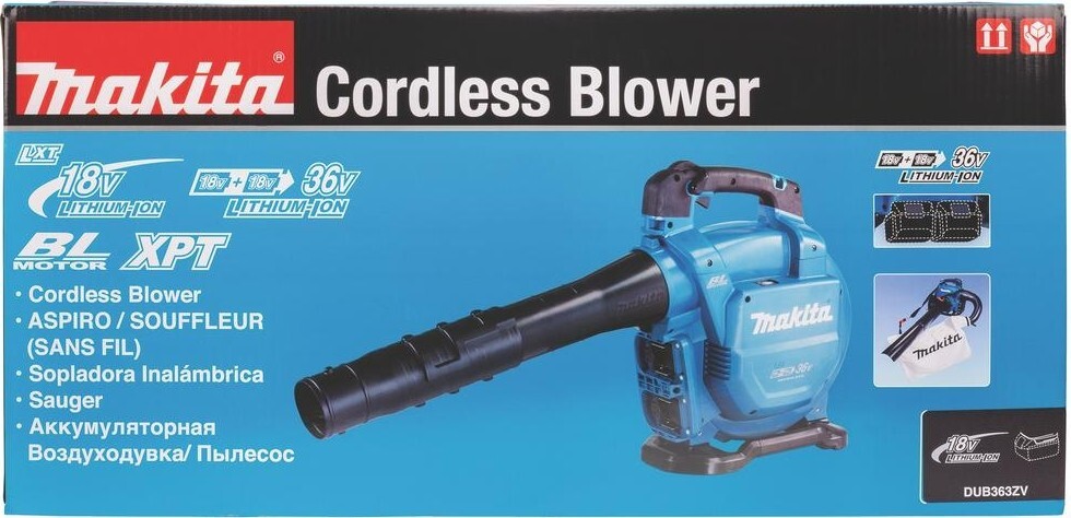 Воздуходувка-пылесос Makita DUB363ZV дополнена режимом всасывания, значительно расширяющим функциональность инструмента. Электроника воздуходувки отключает привод при превышении допустимого тока, перегреве и снижении напряжения на клеммах батарей ниже допустимого уровня. При применении воздуходувки Makita DUB363ZV в качестве пылесоса всасывающая труба устанавливается сбоку - вместо крышки вентилятора. Перевод в режим пылесоса и воздуходувки осуществляется нажатием на переключатель питания и отображается индикаторами режима. Для комфортной работы привод воздуходувки Makita DUB363ZV оснащен другой электронной функцией – постоянным контролем скорости. Она поддерживает частоту вращения независимо от нагрузки. Поставляется без аккумулятора и зарядного устройства.