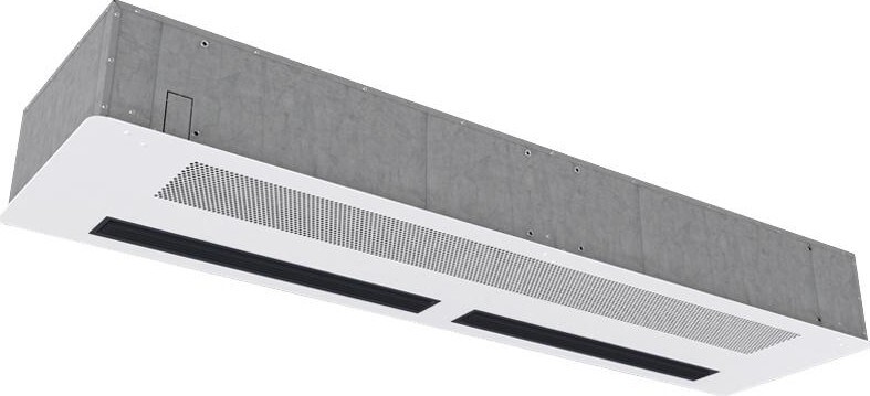 Встраиваемая потолочная воздушно-тепловая завеса для проёмов высотой до 3,5 метров. Тепловая завеса предназначена для скрытой установки за подвесным потолком. Сервис и обслуживание осуществляется через переднюю панель завесы.